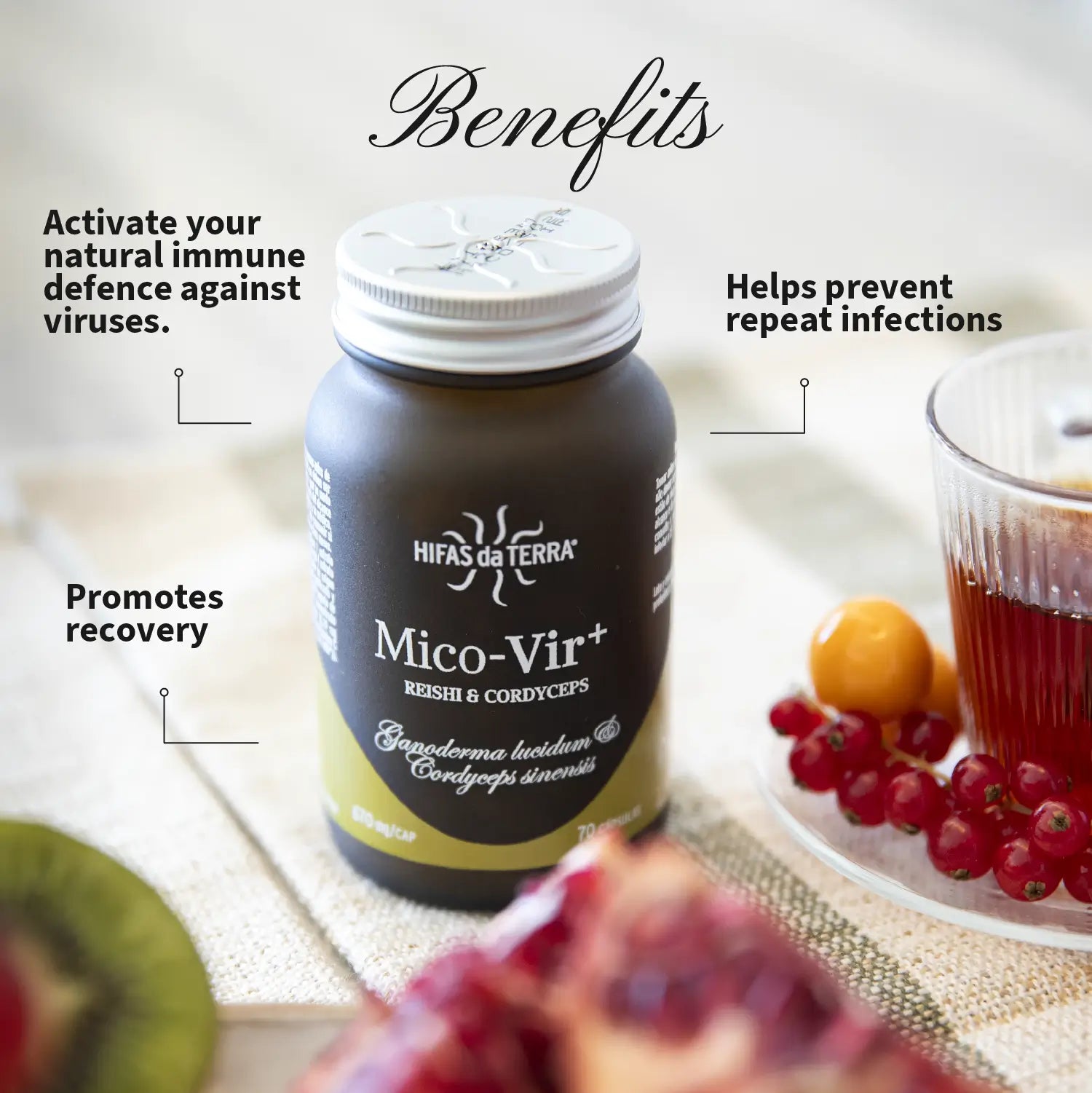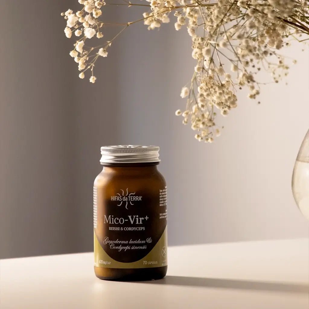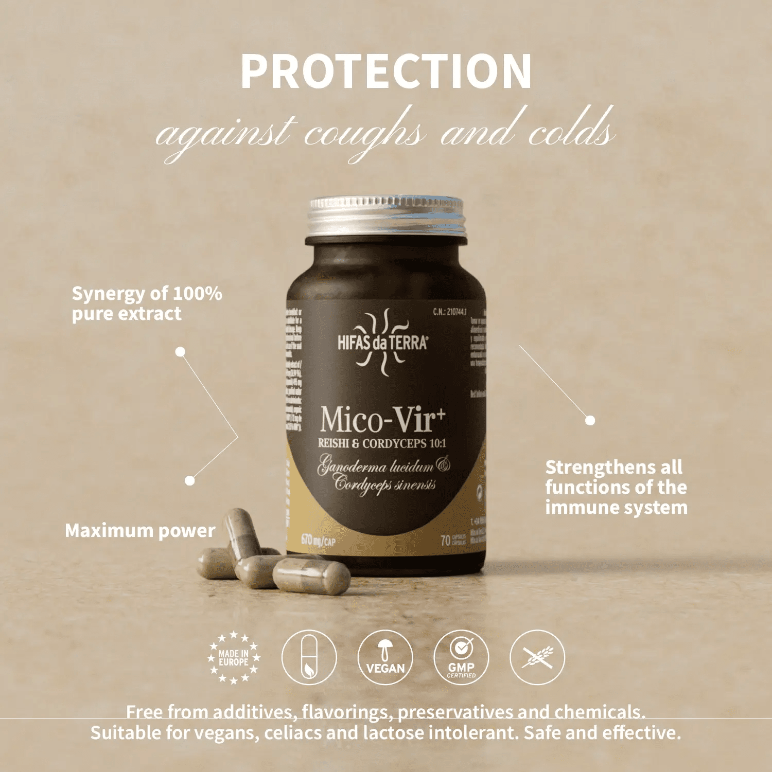 Bioactive IngredientsThe supplement in capsules based on pure extracts of Reishi and Cordyceps, Mico Vir+, contains the highest concentration of active biomolecules with action such as ꞵ-(1-3), (1-6) D-glucans, ɑ-glucans, triterpenoid compounds, ergosterol, cordycepin, ganoderic acid, and ɑ-linolenic acid. The new Mico Vir+ is a formula rich in active, safe and effective nutrients to help the body in recovery processes based on the power of the synergy of two of the medicinal mushrooms with the most studies and clinical trials.