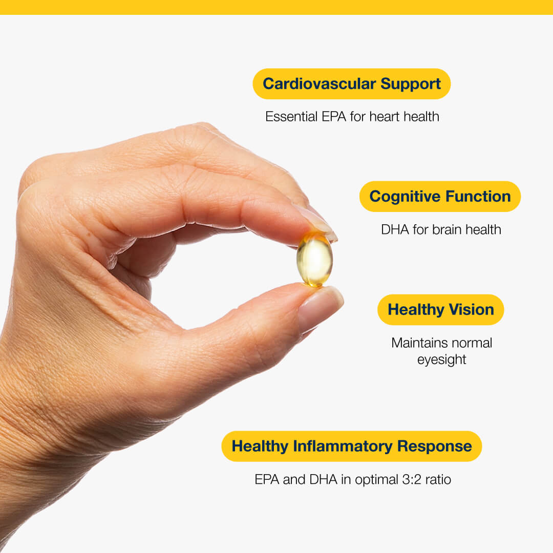Omega-3 mini-capsules providing essential fatty acids EPA and DHA in their natural 3:2 ratio to support brain, vision & heart.