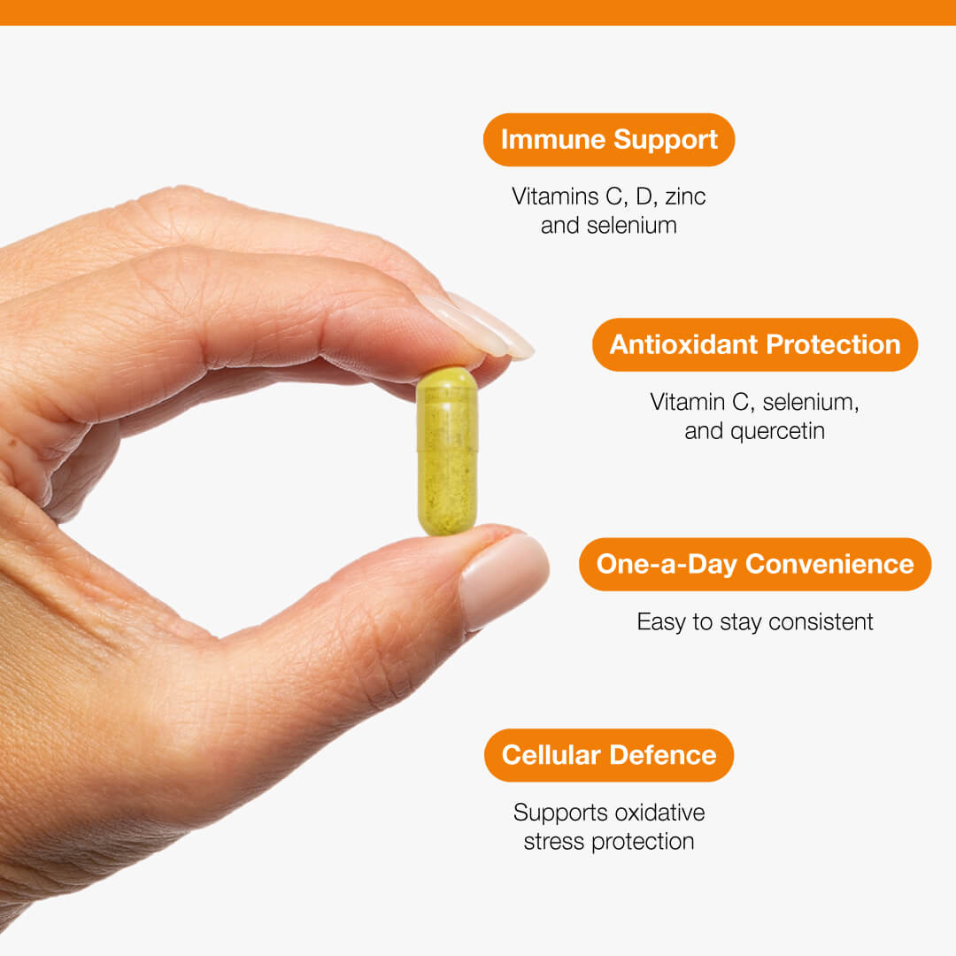 One-A-Day capsule containing key nutrients for immune support, including vitamins C and D, minerals zinc and selenium, and the flavonoid quercetin.